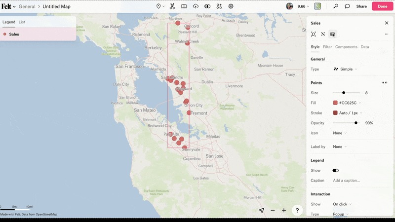 Felt automatically geocodes your addresses as soon as you upload them. You see your data on the map right away — no extra steps or manual input required. You can then use the geocoded data to create detailed, interactive maps ready for analysis and collaboration.